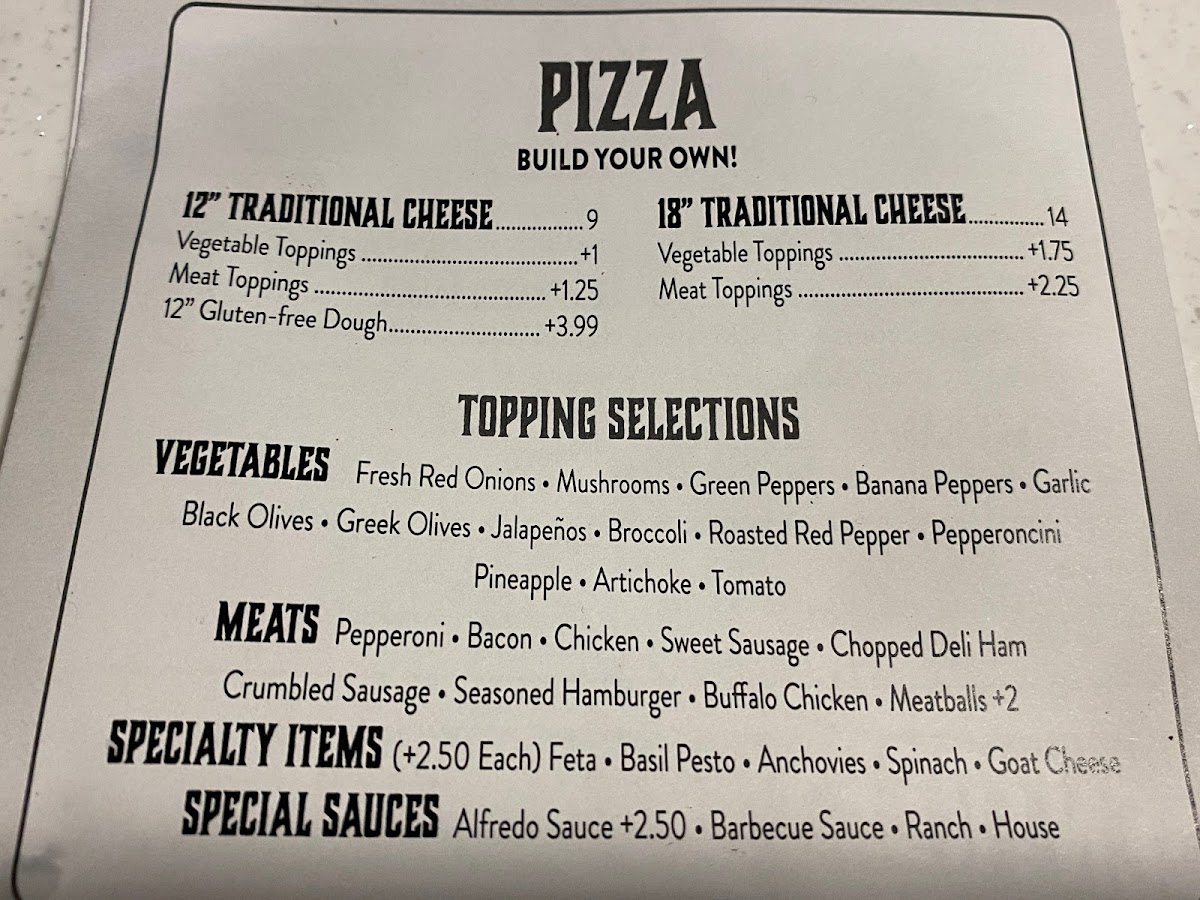 Classic pizza sauce, mozzarella cheese, pepperoni, hamburger, bacon, sausage, ham, red onion, green pepper, black olive, and mushroom